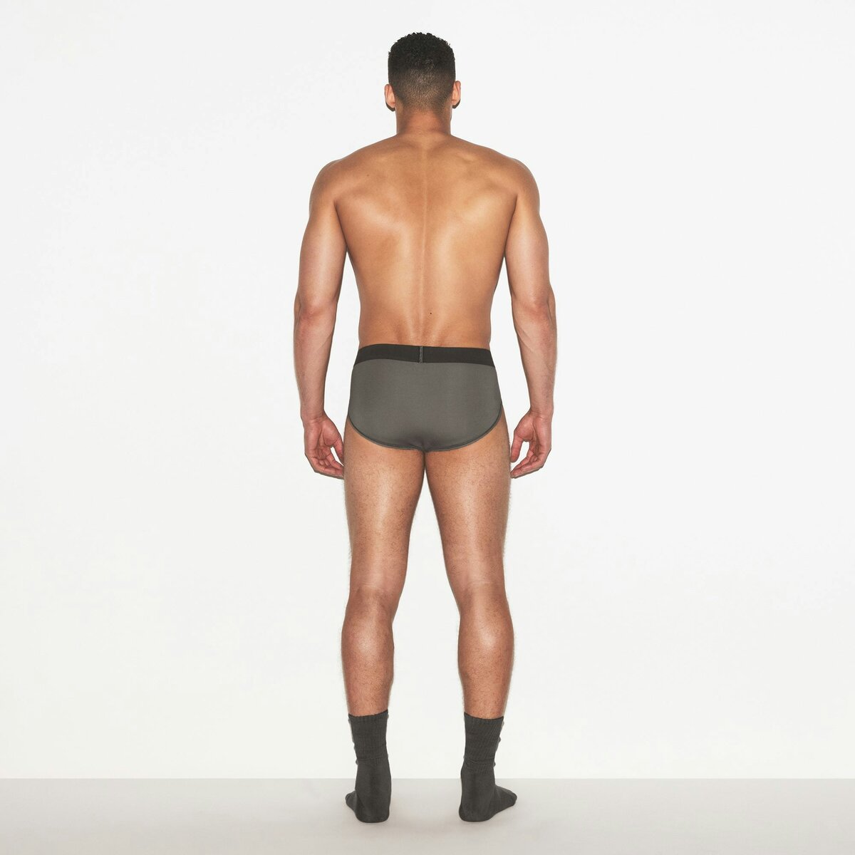 - Breathable mid-weight Cotton, Spandex for recovery and stretch, SKIMS branding on exterior waistband, Engineered pouch and gusset for comfort