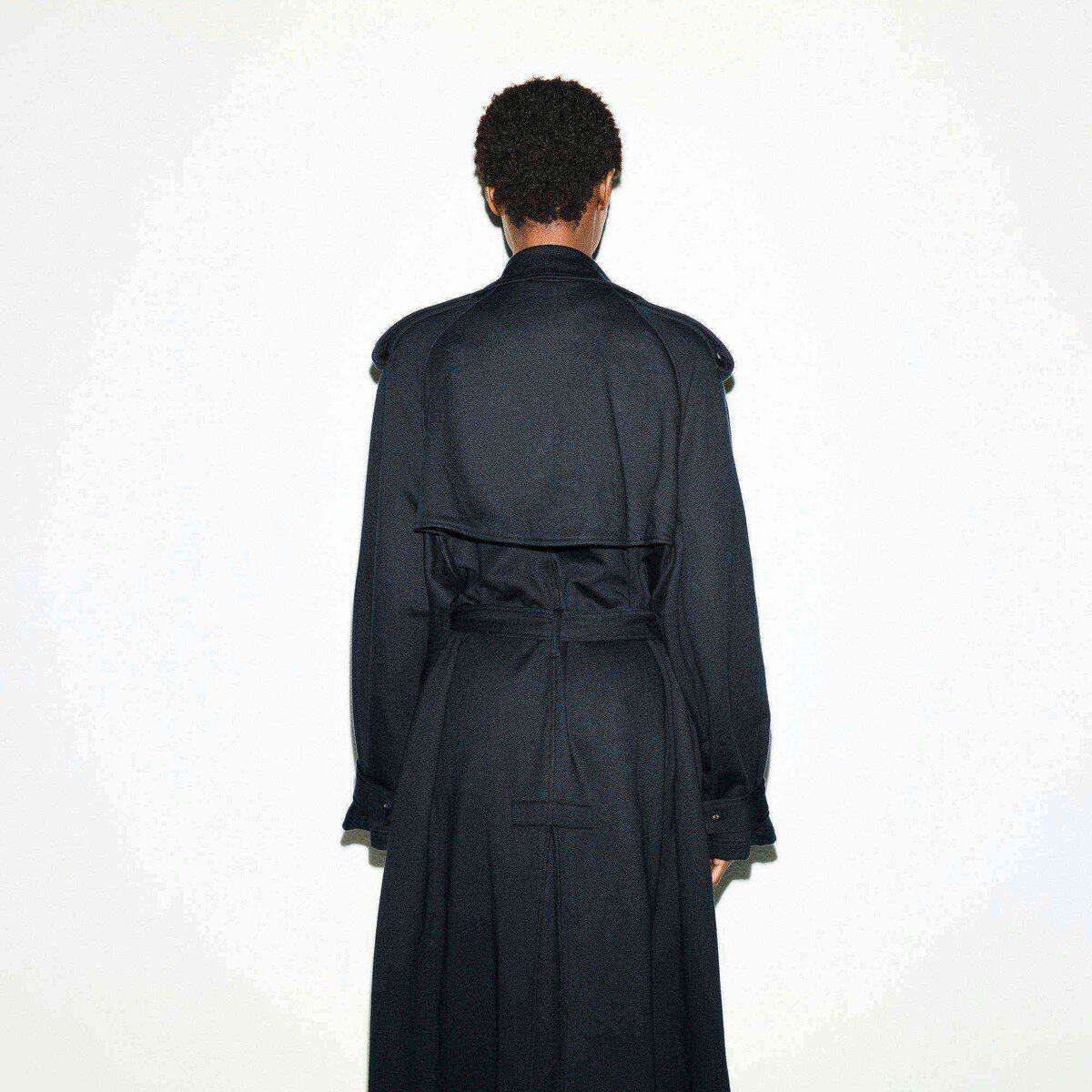 • Pointed collar, Self covered buttoned, Epaulets at shoulder and sleeve, Front and back storm, Flaps, Self tie for adjustability, Welt pockets, Pleat detail at back, Long length, Relaxed fit, Unlined