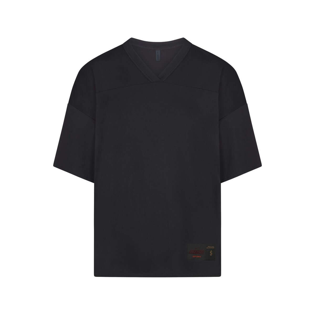 - V-neck, Raglan short sleeves, Front side and back seam details, Woven logo patch on wearers left, Oversized fit