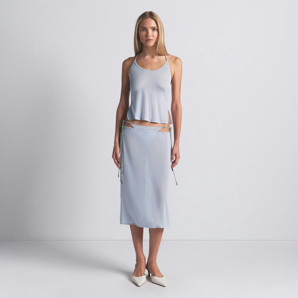 Low rise, high shine. This midi skirt sits at the hips and features side keyhole cutouts with rhinestone cord ties. Designed in a sheer knit fabric with a relaxed fit, it’s perfect for pairing with the matching bralette or cami for a full-on festive look.