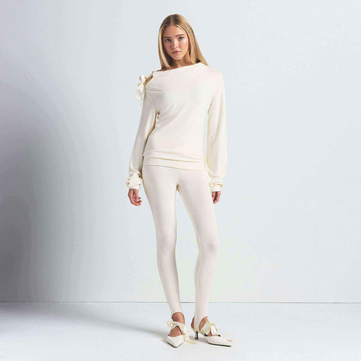 Sheer meets sleek. These fitted pants feature a stretchy waistband and satin ribbon stirrup detail along the sides for a playful twist. Designed to pair with your favorite Cloud top or bralette for an ultra-feminine ensemble.