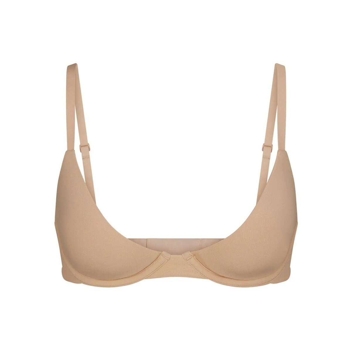 - New Fits Everybody lightly lined Bra that combines new technology with a SKIMS aesthetic, Plunge scoop neckline, Bonded neckline with no stitching to allow fabric lay flat against your skin, Adjustable straps, Hook and eye back closure, Molded lightly lined cups, Flexible underwire for support, Special innovative technology on the cup to offer a comfortable and customized fit, Stretch center gore to fit in between sizes, 360 stretch comfort to fit