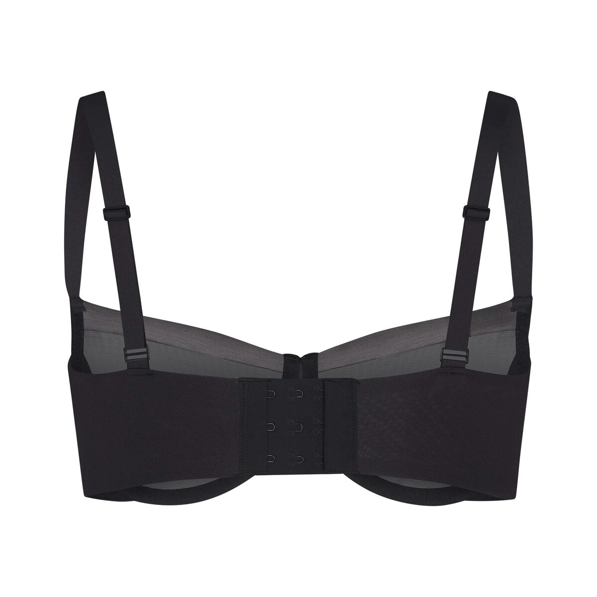 - Flattering straight neckline, Sheer unlined cups, Lightweight and flexible underwire for support, Bonded and fully adjustable straps, Bonded neckline, Straps and wing for stability, Wide microfiber wing for extra smoothing, Free cut edges for a seamless look under clothing, Tonal SKIMS logo on front wing, Hook and eye back closure