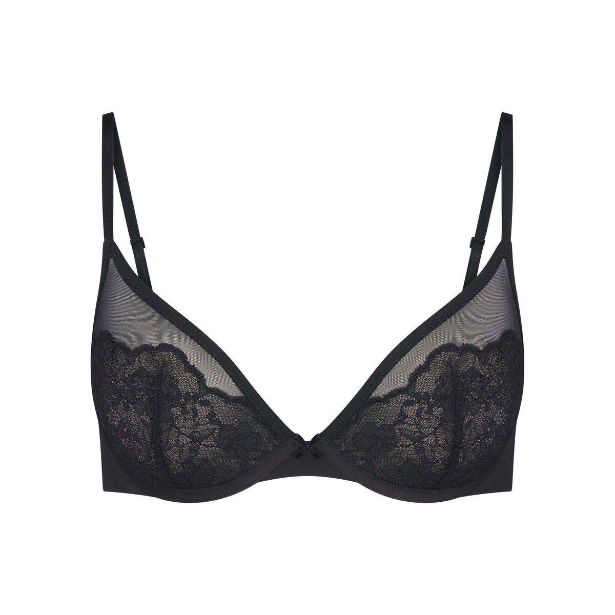 Soft, supportive, lacy. This demi bra features unlined lace cups and a bow detail at the center front for an ultra-feminine look. Designed with a smoothing microfiber wing and supportive underwire. Complete with adjustable, convertible straps and a hook and eye back closure. Fits true to your SKIMS bra size.