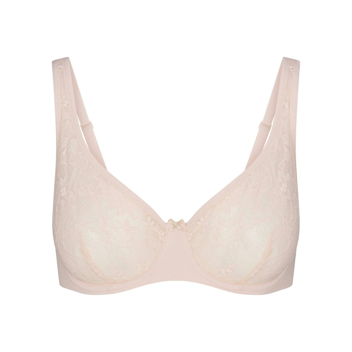 Reduce your breast projection by up to two inches with this minimizer bra, made from the softest microfiber fabric and lace detailing. This solution features unlined full coverage lace cups and an underwire for support. Designed with a smoothing microfiber wing and bow detail at the center front. Complete with adjustable, convertible straps and a hook and eye back closure. Fits true to your SKIMS bra size.