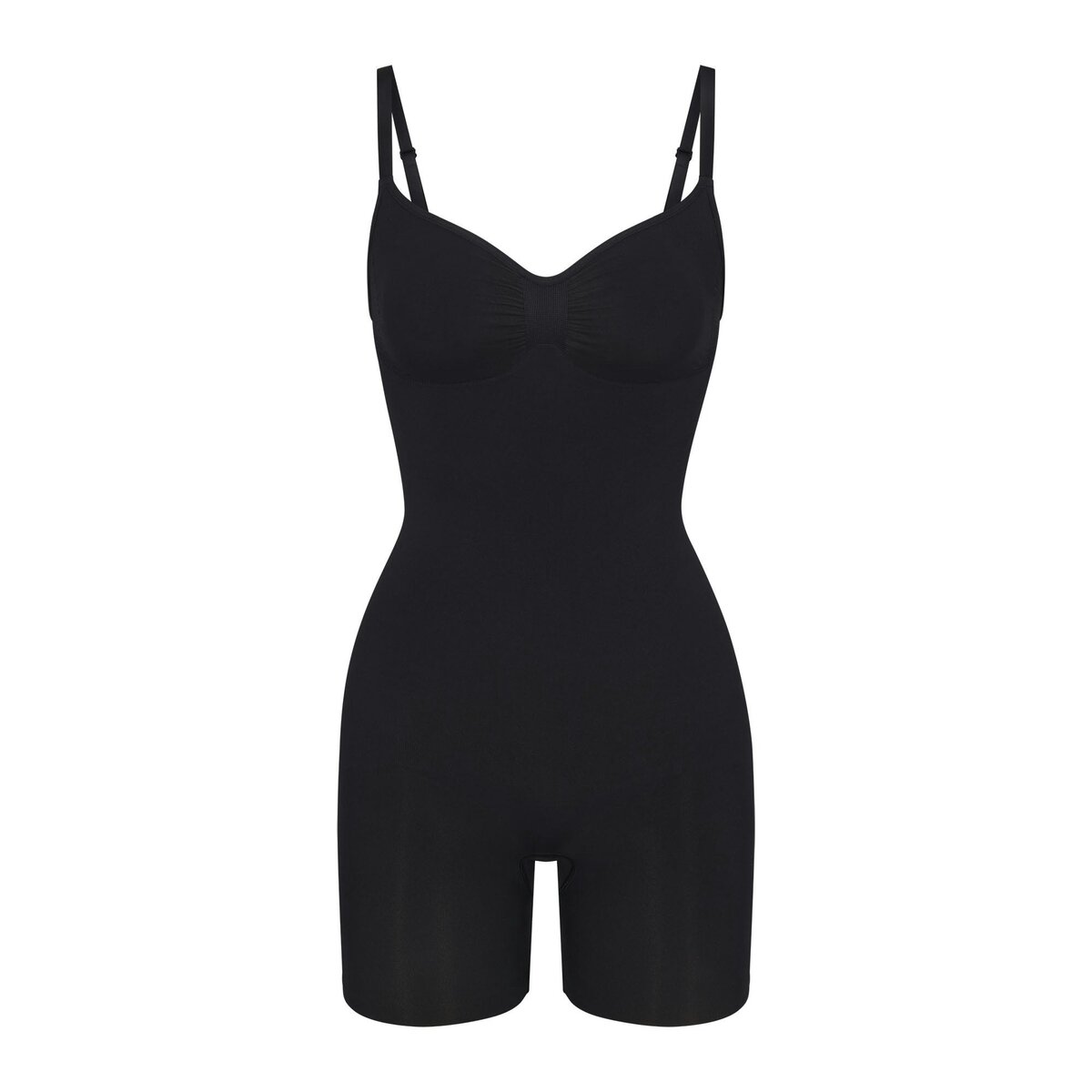 - Scoop front neckline, Adjustable straps, Strong compression along tummy, core and waist, Wide gusset for added coverage, Pockets at butt to lift and add butt definition, Strong compression along back thigh to really help provide lift, Hits at mid thigh, Open gusset