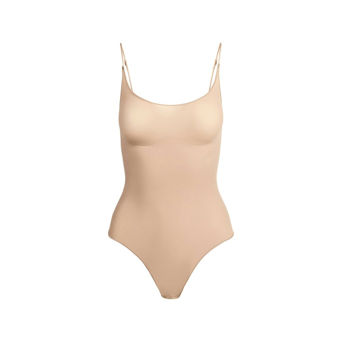 - Scoop neckline, Adjustable rouleau straps, Thong back coverage, Snaps at gusset, Target area: core