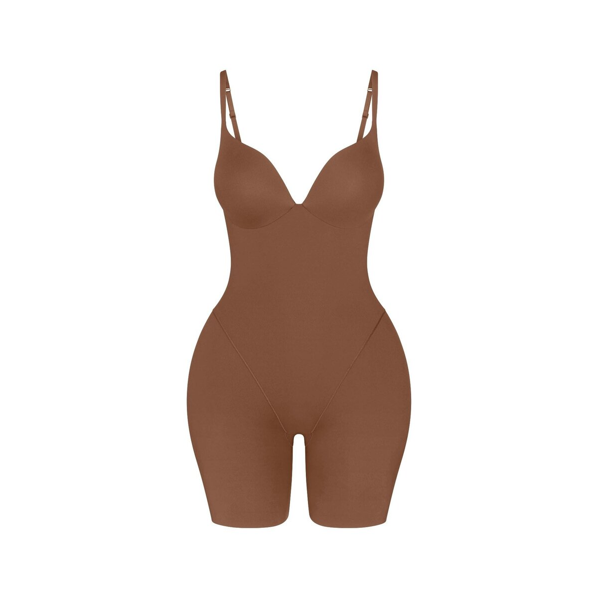 • Skims ultimate push-up cups, Adjustable straps, Embedded foam butt pads, Embedded foam hip pads, Power mesh lining at front for added compression, Open gusset, Raw cut leg opening, Mid-thigh length