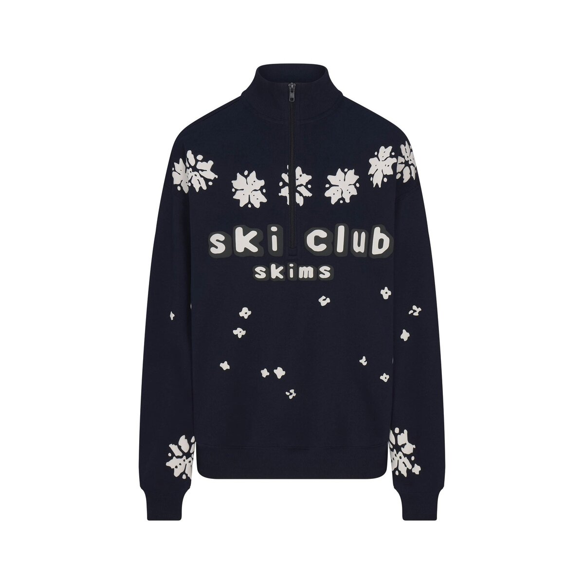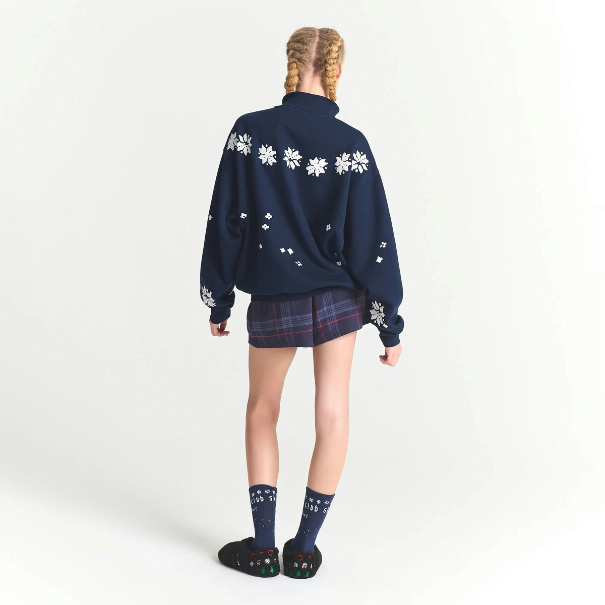 - Mock neck, Quarter zip at center front, Rib neck, Cuffs and hem, Oversized fit