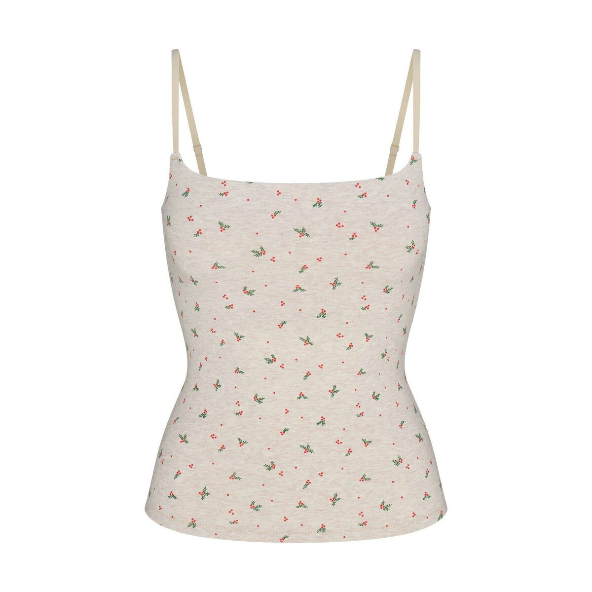 No other cami compares. With its soft, breathable feel and fitted silhouette, you’ll keep coming back to the comfort of this off-duty style. Offers light bust support from the interior shelf bra and underbust elastic. Features a scoop neck and adjustable straps. Hits below the natural waist and fits true to size. Available in limited edition print: Oatmeal Holly Print.