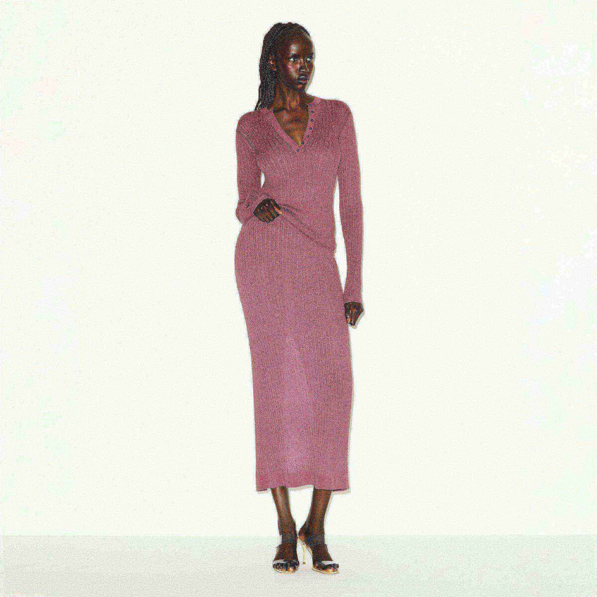 • Crew neckline, Henley detail with metal buttons, Long sleeves, Fits tight to body, Long length