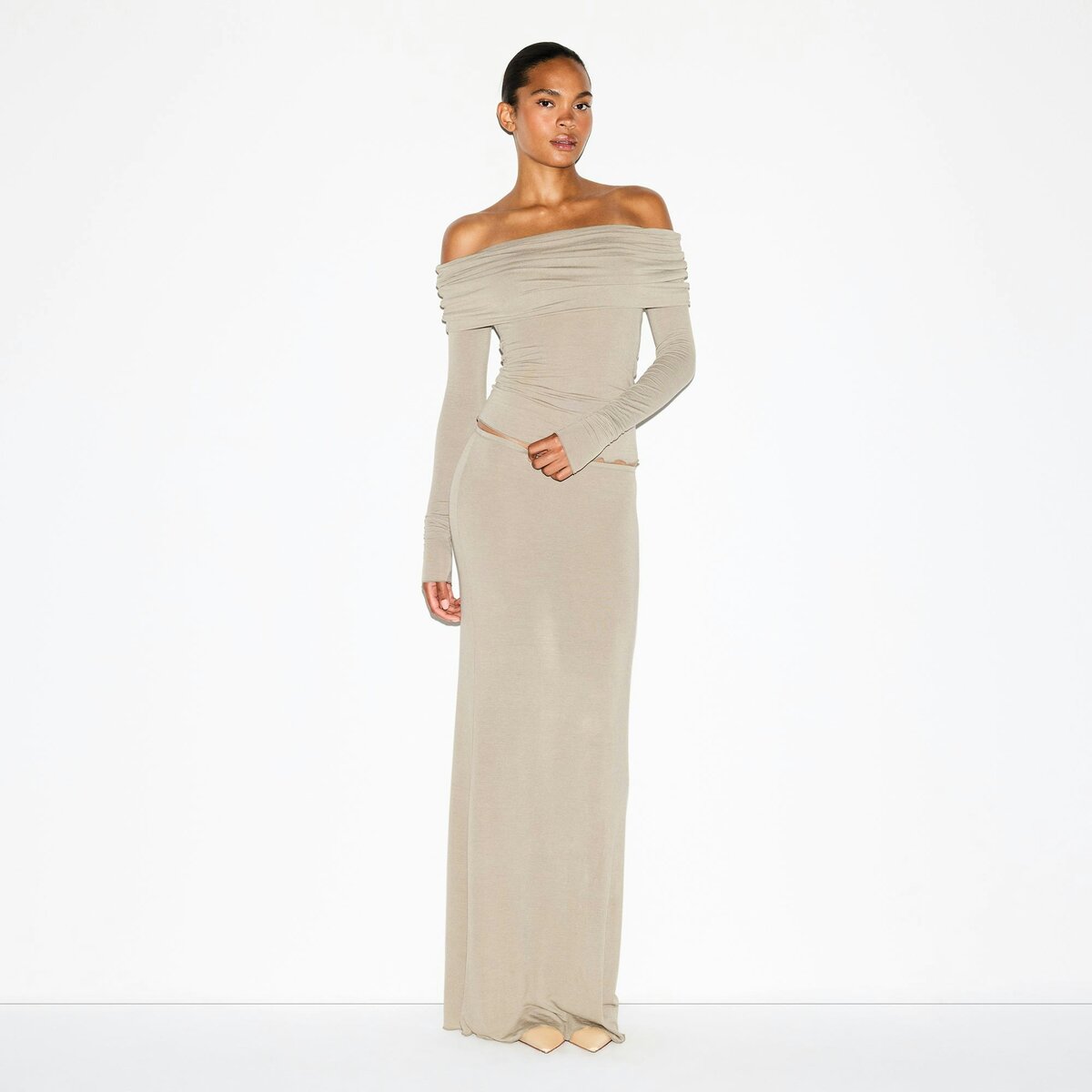 Effortless allure meets elevated style. With a sheer look and body-hugging fit, this chic off-the-shoulder top is perfect for any occasion. Made from our soft and stretchy modal-cashmere fabric, this style features exaggerated long sleeves for an elevated finish. Fits true to size.