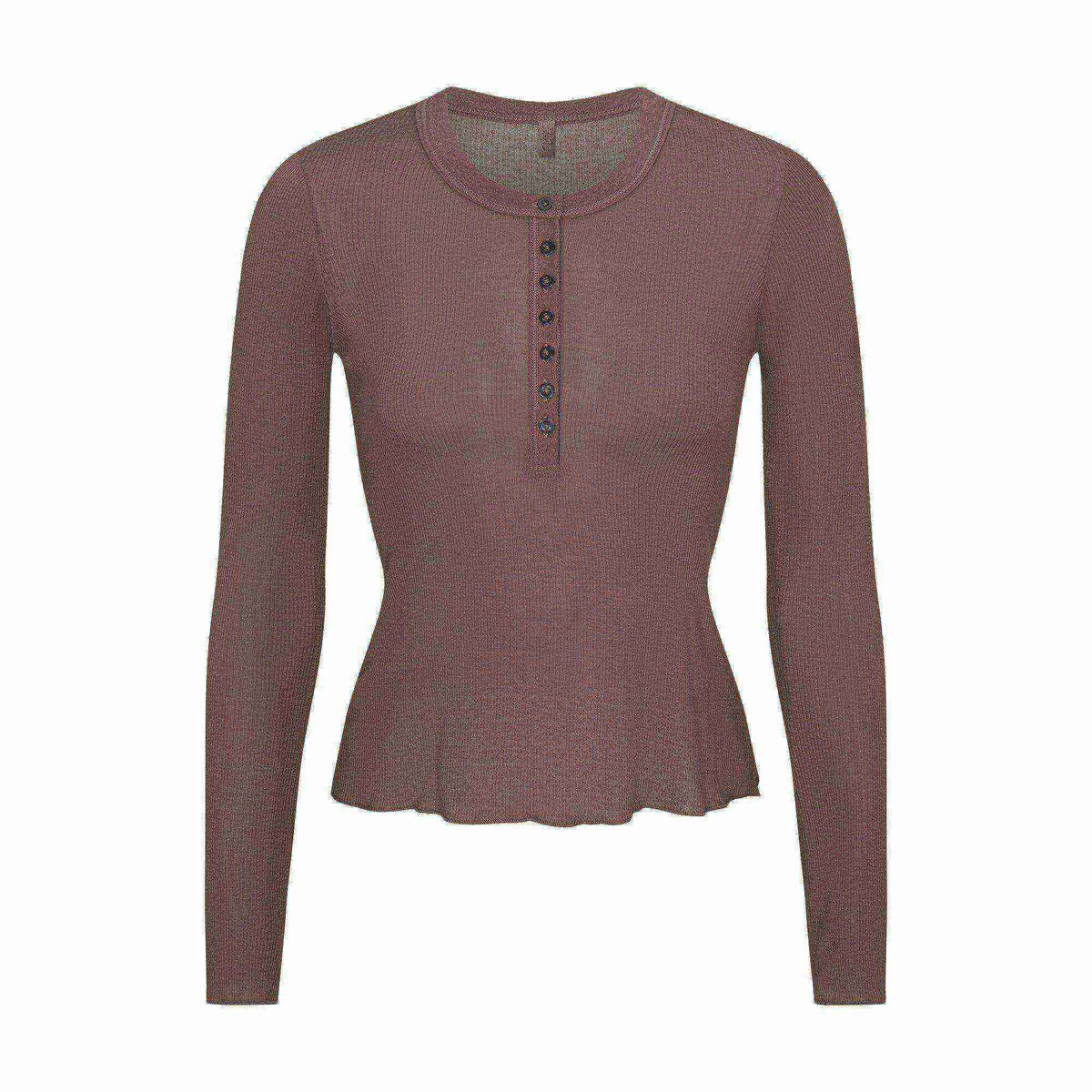 Airy, sheer essential. This long sleeve henley is made in our lightweight ribbed fabric for a flattering, sexy look. Complete with a center metal button…