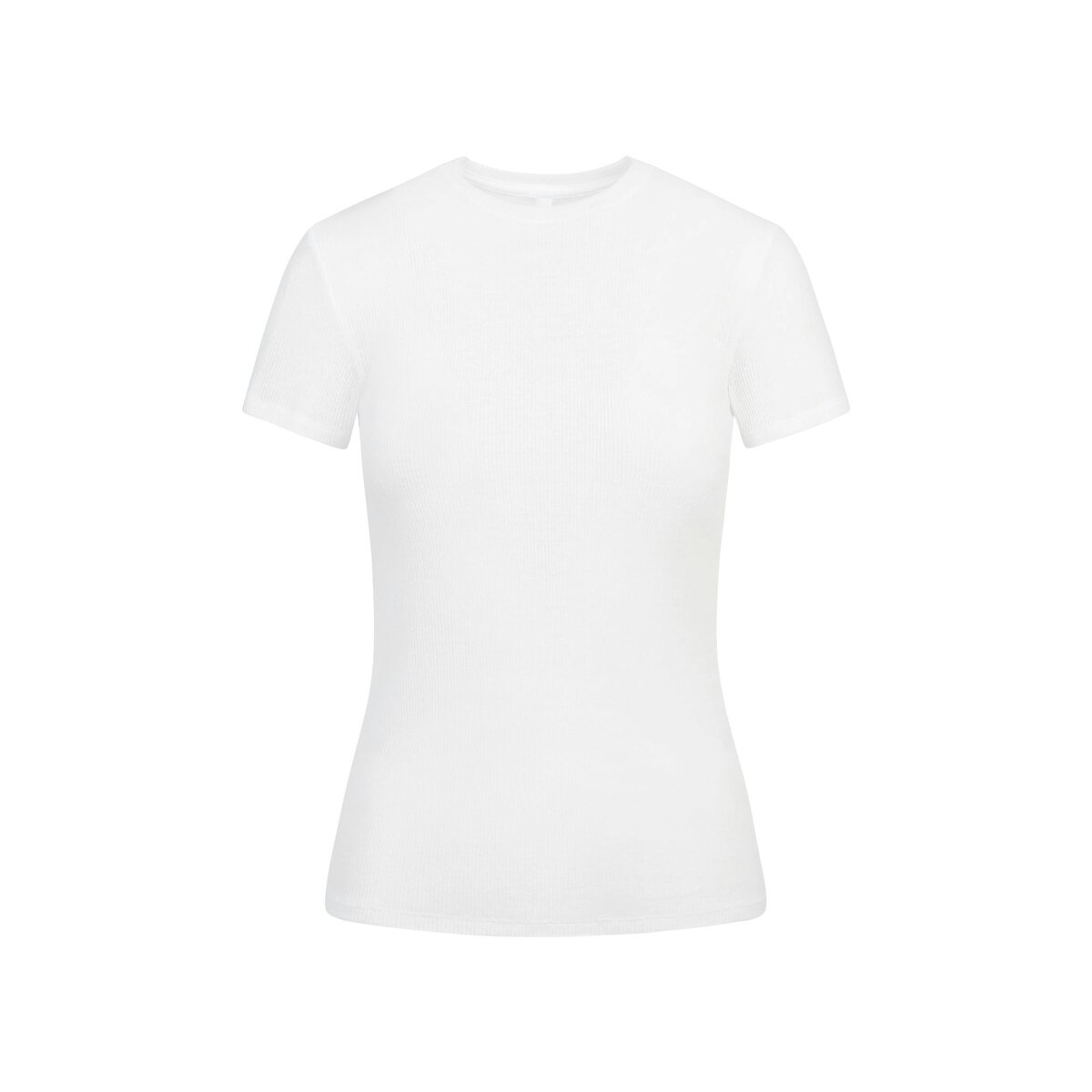 - High crew neckline, Short sleeves, Fits tight to body, Standard length