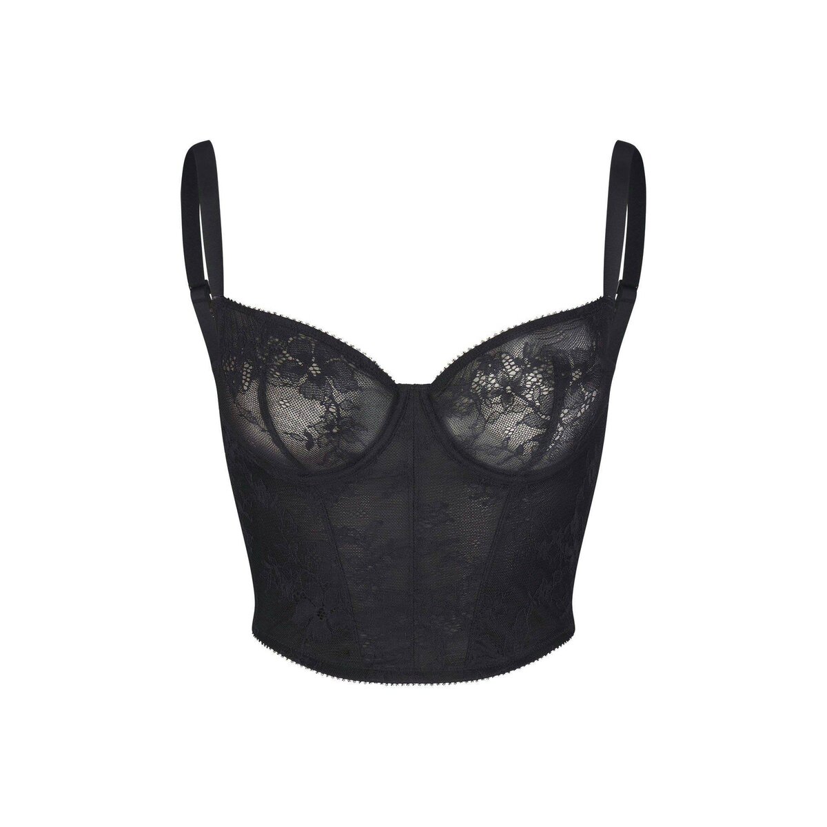 - Balconette neckline, unlined lace cups, underwire for support, adjustable straps, picot elastic at neckline, underarm, top wing and hem, steel boning at interior side seam, hook & eye closure at center back, designed in a sheer lace