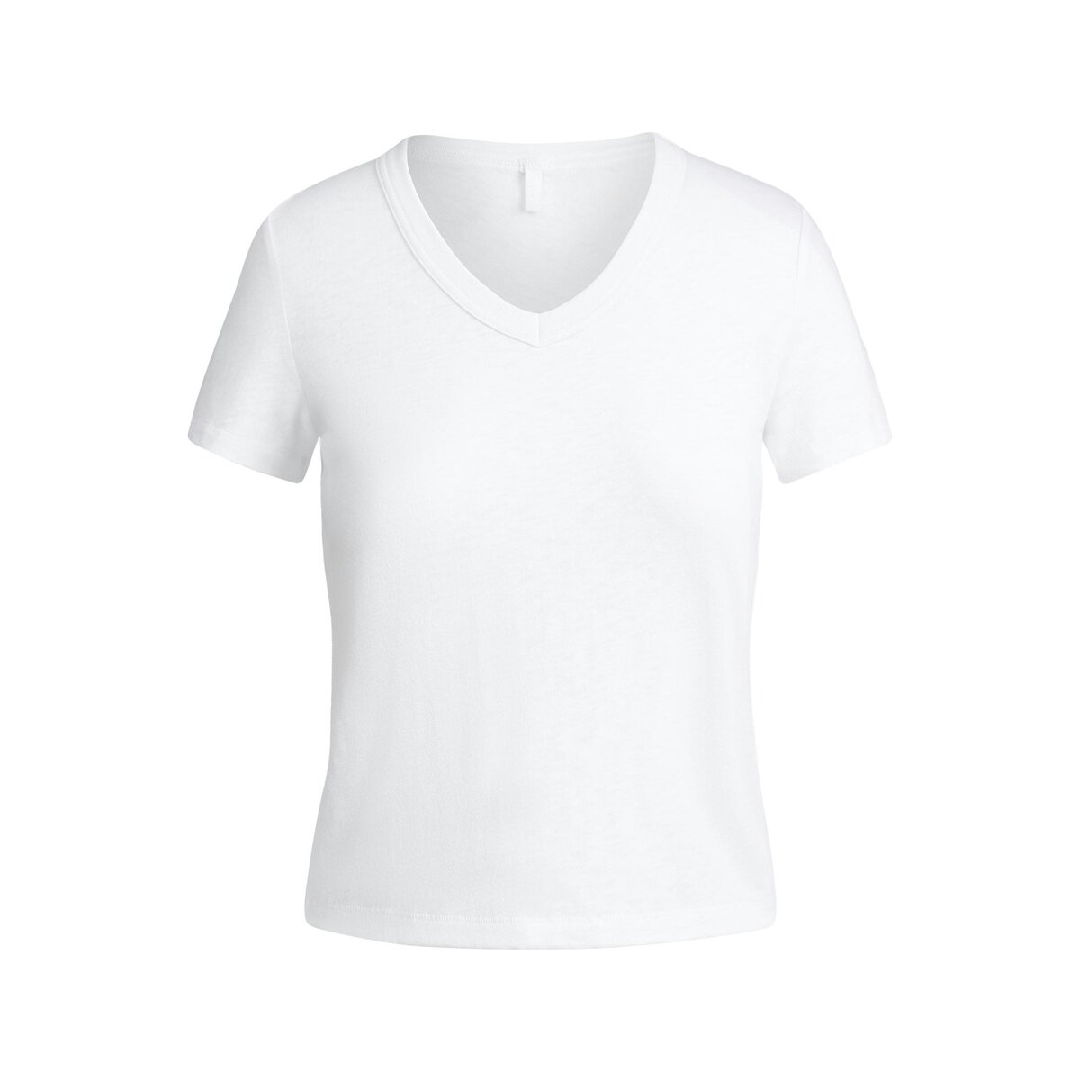 The perfect everyday tee. This v-neck baby tee is made with our soft, breathable 100% cotton for long-lasting comfort. Features a ribbed neck and SKIMS logo label at the center back neck. Fits true to size.